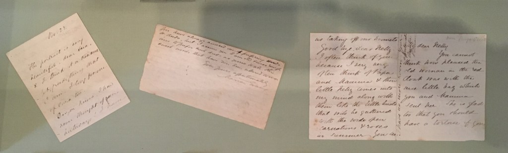 The Herbert exhibition contains many interesting, memorabilia of her life locally, her writing desk and writing board, with stationery cabinet and personal letters. Items of clothing, a lace bonnet and cape, leather gloves and an opal ring amongst other items belonging to her and her family. Her life is mapped out with contemporary images of her homes and people close to her. She considered herself to be not blessed with good looks, however her portrait by François D’Albert Durade, painted when she lodged with him and his wife in Geneva in 1849, portrays a warm, kind, generous woman with engaging blue eyes.
