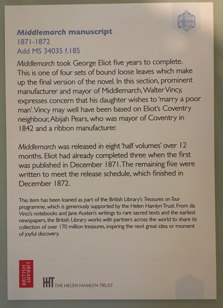 There has always been pride in Nuneaton for their famous daughter Mary Ann Evans, the name George Eliot was a pseudonym to ensure her anonymity in the male dominated world of writing and publishing. Her unfailing love and reverence for Warwickshire and its people is illustrated in her novel’s characters and situations, many of which can be traced to places and people she knew well. She moved with her father to Coventry, having attended school there too, but Coventry has not appreciated her as fully as the lovers of George Eliot would like. This is in the process of being addressed by the George Eliot Fellowship, and the recent exhibition of George Eliot at the Herbert Art Gallery & Museum goes some way to encouraging a renewed dialogue of her association with the city. The exhibition at the Herbert includes a prestigious loan of the original manuscript for her grand and beautiful epic novel Middlemarch from the British Library. Open in a case so that her handwriting and amendments can be seen is a wonderful insight into the writing process. This will be on show as part of the British Library Treasures on Tour programme until the 5th January 2020 when it will move to Nuneaton for 8 weeks.