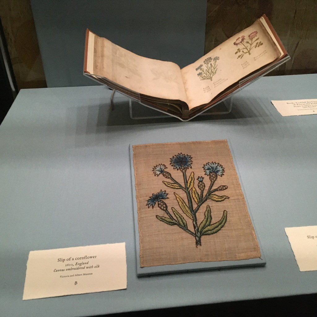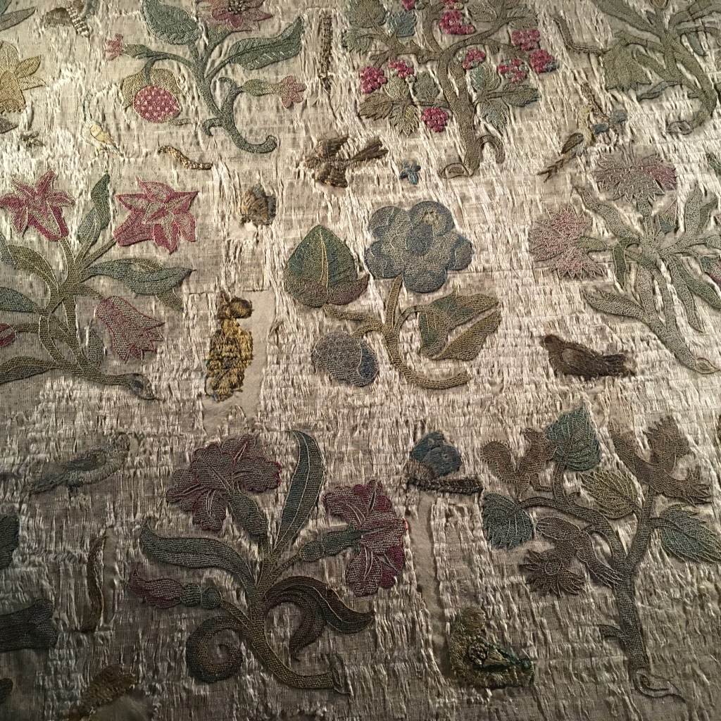 Eleri Lynn’s team identified the use of a red dye found in Mexico, and Indian indigo blue dye from Portuguese trading routes, further proving the provenance of high quality expensive raw materials. The texture of the stitches, with french knots creating the centres and stamens of the flowers, and bullion stitch comprising the raised fat bodies of caterpillars that look as though they could wriggle off the cloth are beautiful. Trees with delicate leaves, satin stitch petals with tight buttonhole stitch to create the centre of a flower all using thread that the reverse of the cloth reveals was brightly coloured and sparkling with gold and silver detail. It is a most beautiful and exquisite work of art.