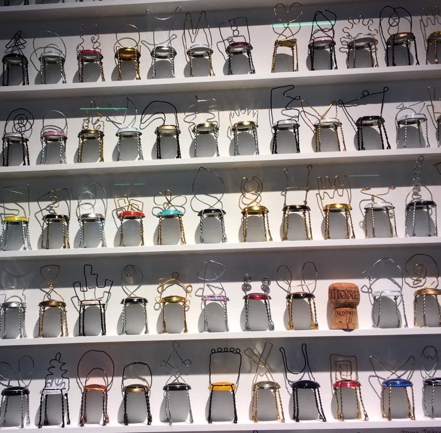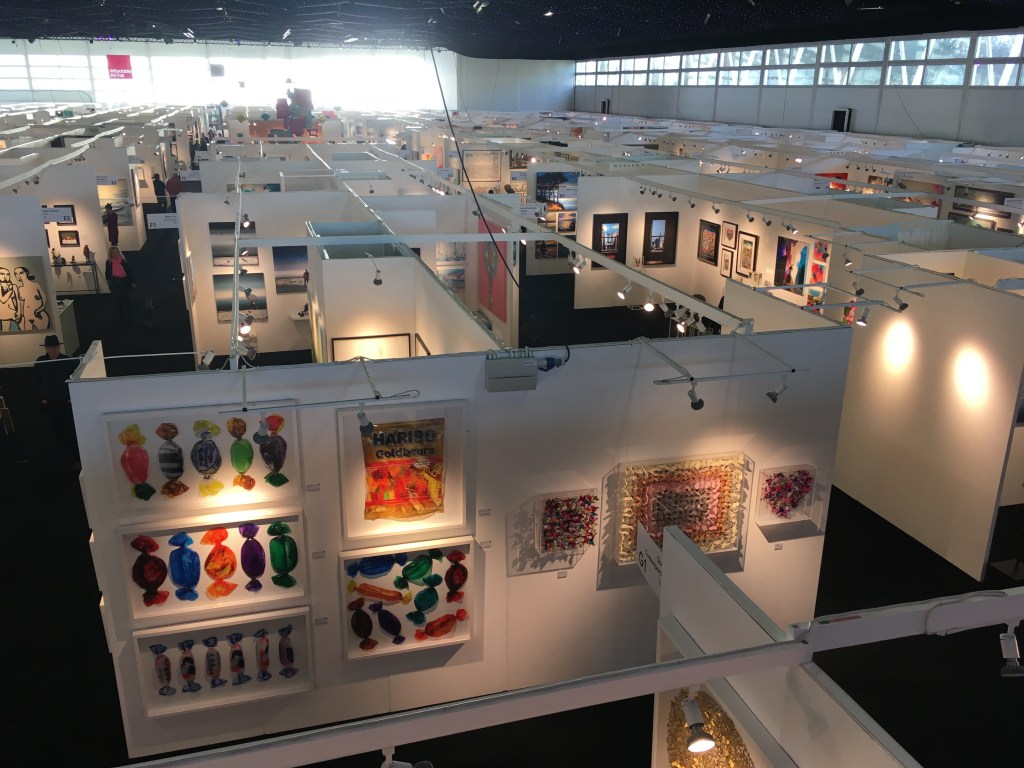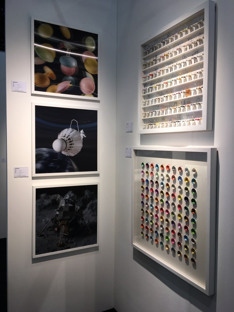 Woolff Gallery show a series of witty chairs Please Take A Seat by Joanne Tinker, displayed together in a grid, all fashioned from a cage around a champagne cork, was ingenious and fun, as was the astronaut on a confectionery flying saucer or a shuttlecock by Patrick Boyd.