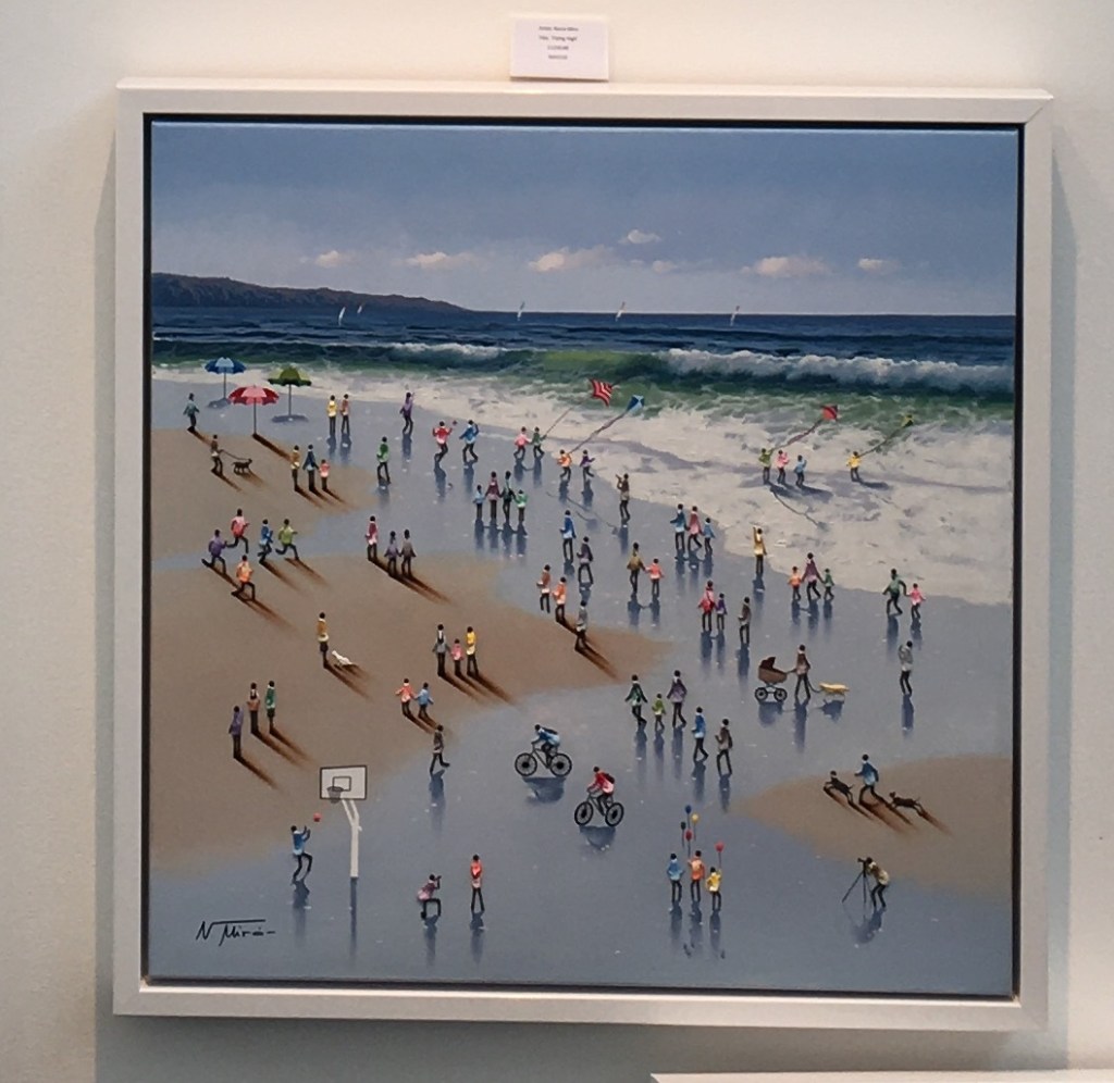 The skilful depiction of shadow in paint and the brilliant intricate impasto of the brightly coloured figures on a beach invited a closer look at Flying High by Nuria Miro. The people on the beach flying kites drew the attention to the waves and mirrored the sails in the distance on the sea, whilst on the sand the direction of the shadows to the opposite balanced the composition giving movement to the figures. A delightful painting.
