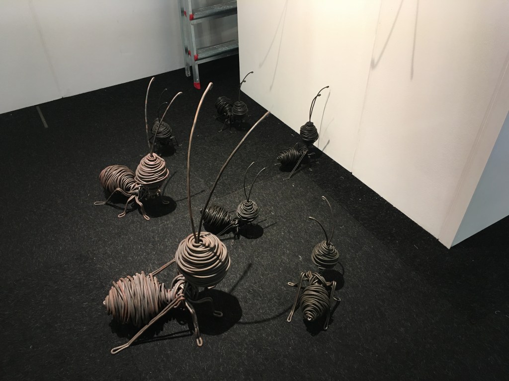 Not quite so elegant, but beautifully set as if scuttling up the wall in search of food were the Iron Ants from Julián Cerón, larger than life, but catching the movement and definition of an ant with coiled and spiralled wire. Apologies for the step ladder, I would have liked to have cropped it out, in fact it should not be visible at all. I was amazed at how many gallery spaces were untidy, with little or no attempt to hide bags, coats, art protection carriers, beer bottles and coffee cups! After all presentation is key.