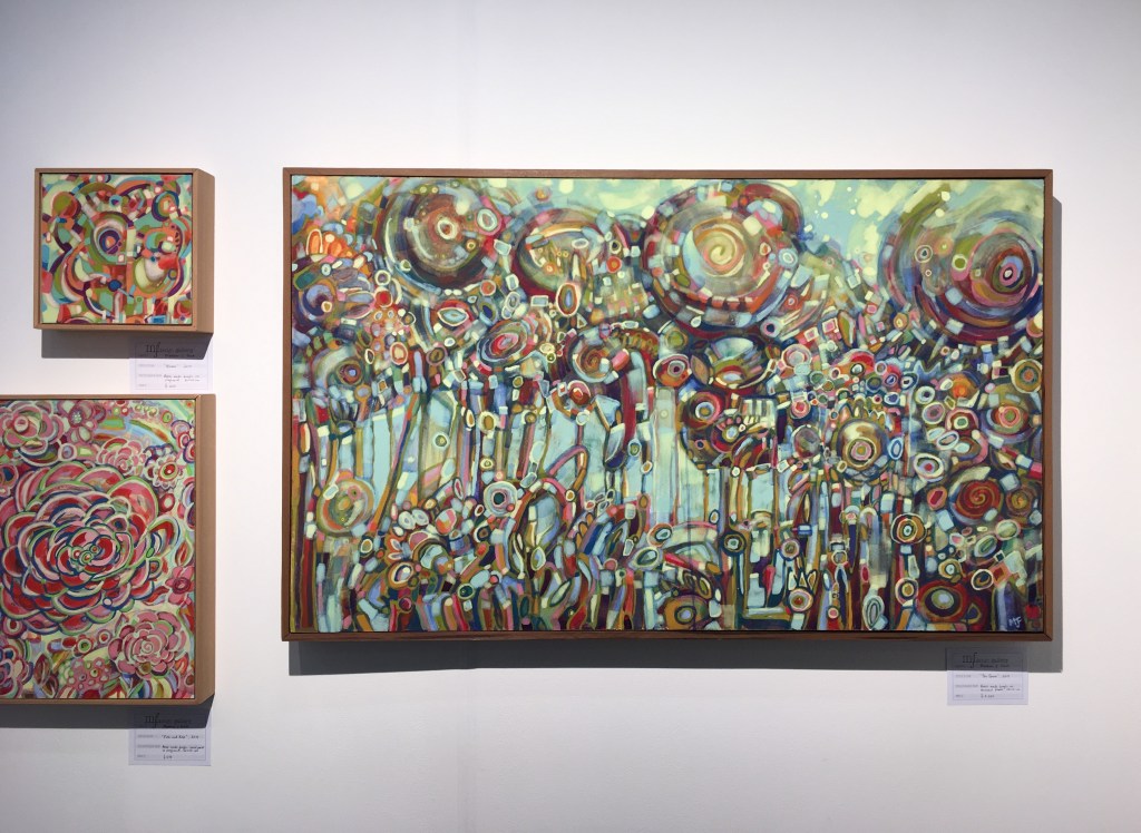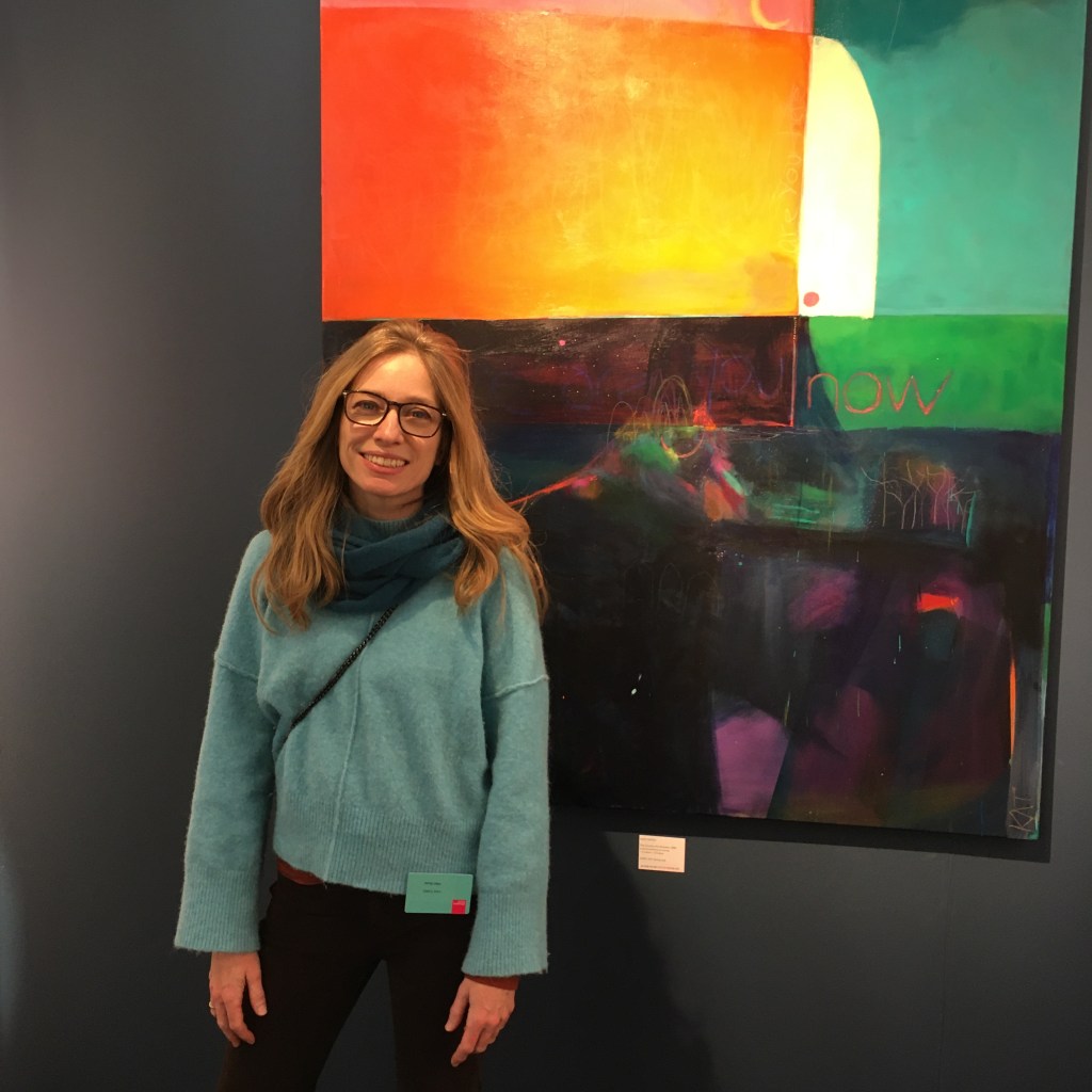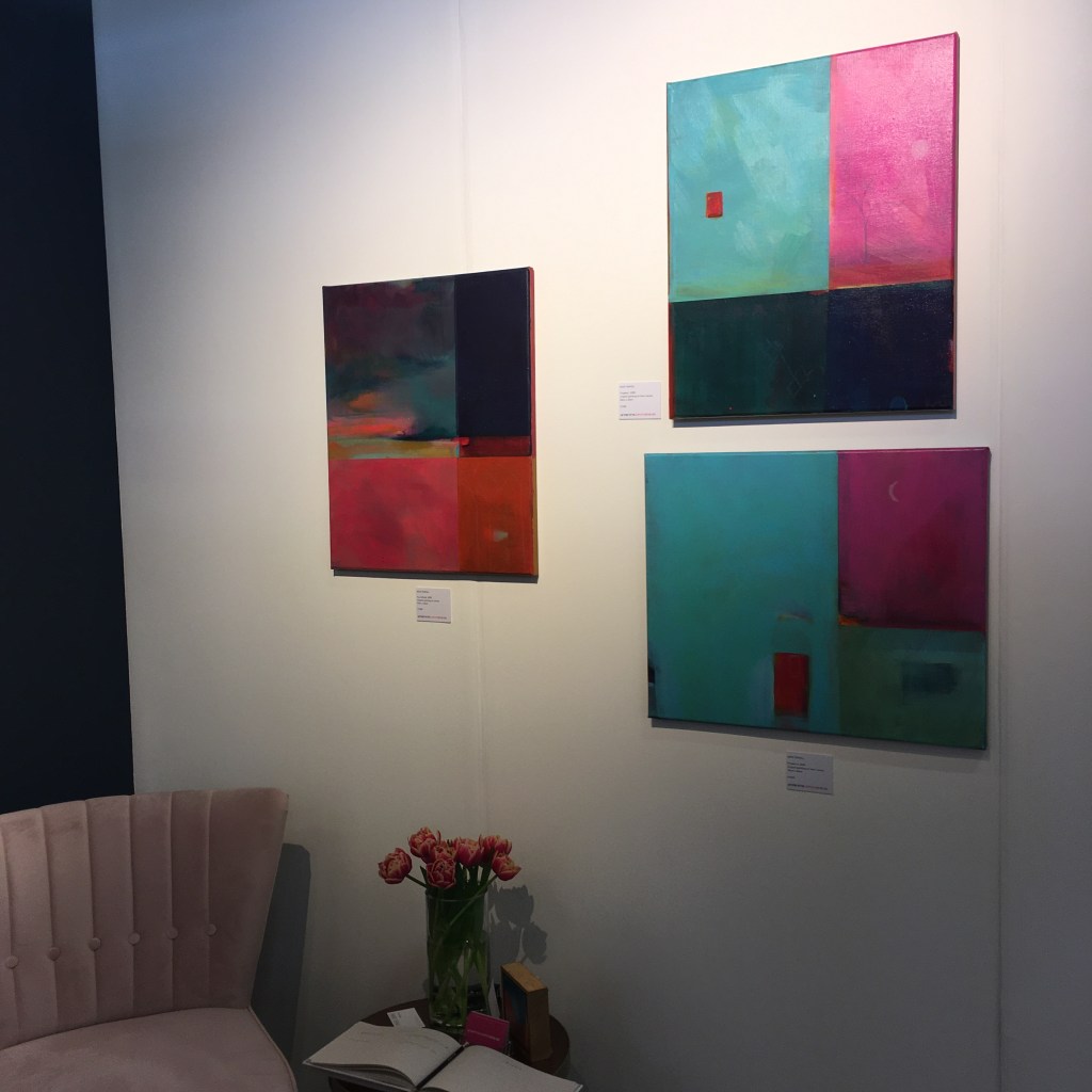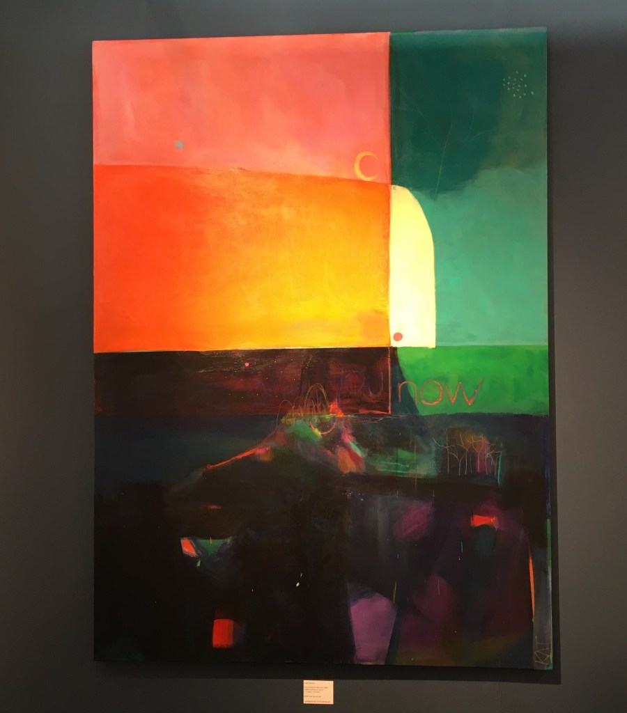 My mobile phone photographs do not do justice to the work of Kate Trafeli. Her luminous, velvety deep colour palette shines with contrasts, clear definition in sections and clever juxtaposing of the colour wheel. She is experimenting with colour and enjoying the effects created by her choices especially in her Serie di Finestre her solo showcase with After Nyne Gallery. Trafeli’s canvas is dissected by panels of colour as if looking through windows which interpreted figuratively or existentially transport the viewer to another place, particularly with In Another Life which combines the four elements and encourages the interpretation of deep water, ethereal air, green earth and flashes of fire on the horizon.