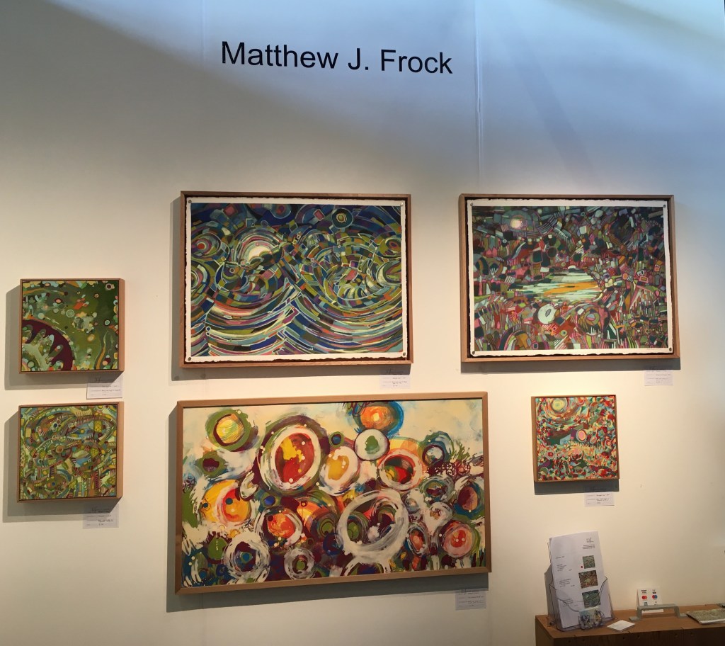 Paintings that caught my attention were from Matthew J. Frock and Kate Trafeli. Matthew Frock’s work was strangely entrancing, a muted psychedelia he described as vivid colours, but I was challenged with finding a term which described the work for me. Not vivid or bright, but substantial and with depth, sludgy but luminescent, muffled but defined, subdued but lively, the battle of contrasting adjectives to define the work is illusive if mesmerising. Frock says The Grove is an example of starting at the top of the paper and working down using the drips the very loose gouache produces to advantage. Frock explains that he mixes his own paint, using binder and pigment to his own requirements, which gives a very thin medium to work with and copious amounts which lasts a long time, so his work across the spectrum is familiar in tone and quality of paint surface. The Grove reminds me of spiral lollipops, or a supernatural wood, the mind finds faces and eerie contorted shapes in a seemingly cheerful landscape. The vortices and holes in some of the work draw you into a weird other world of strange colours.