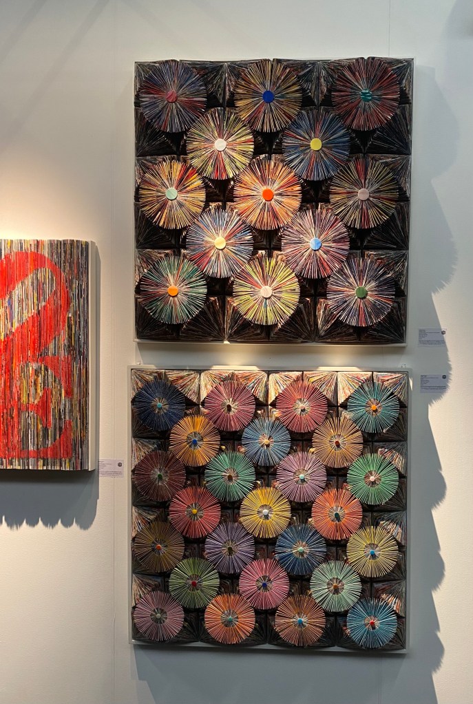 Alberto Fusco exhibiting with TAG Fine Arts uses folded magazines to produce intricate geometric patterns that manifest a sculptural quality that is immensely tactile and invites deep scrutiny. Choosing pages carefully, a blended colour palette is created with what is society’s ephemera. Up-cycling at it’s most inventive.