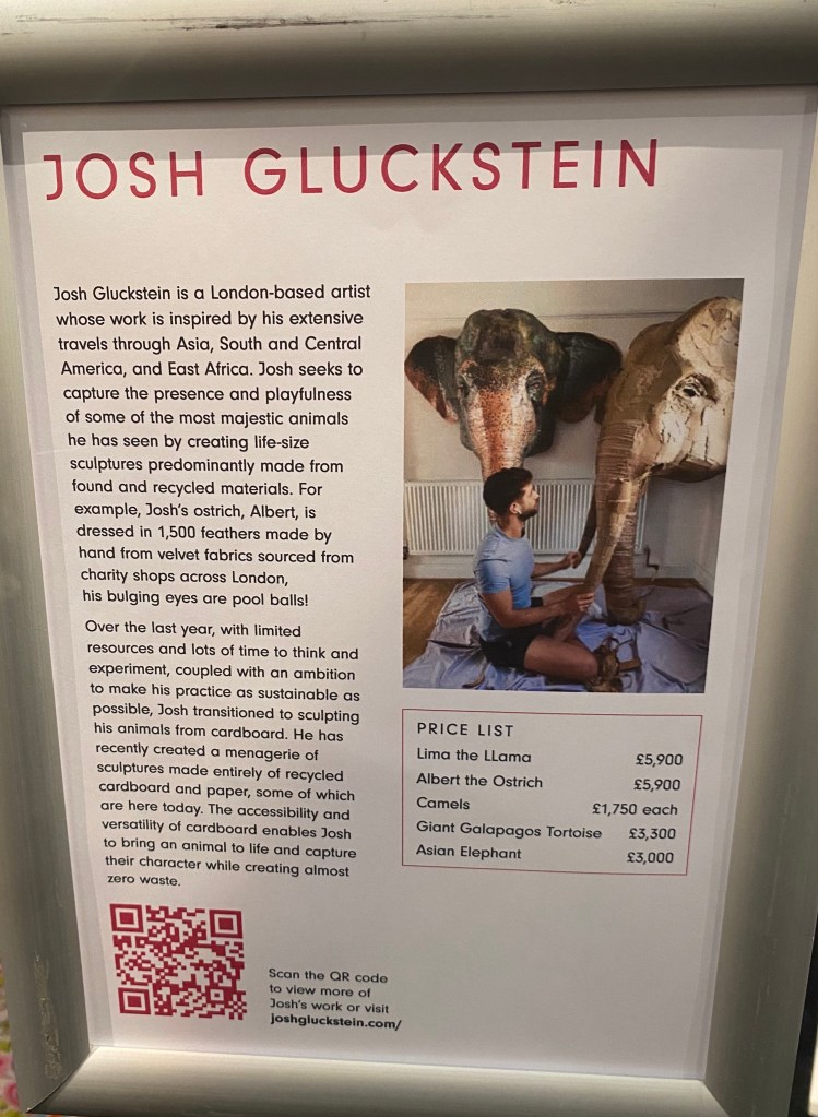 Another hare that took my eye was a delightful bronze statue by Ani Mollereau with Sol Art, entitled Take Me To the Moon the beautiful patina intrigued me, contrasted with the glimpse of the highly polished bronze it evoked an elegance, and sense of wonderment, as the eye followed the gaze of the hare’s head. Musing on what the hare may be thinking I am considering, maybe, with my mojo restored, a return visit to Battersea in October is on the cards…