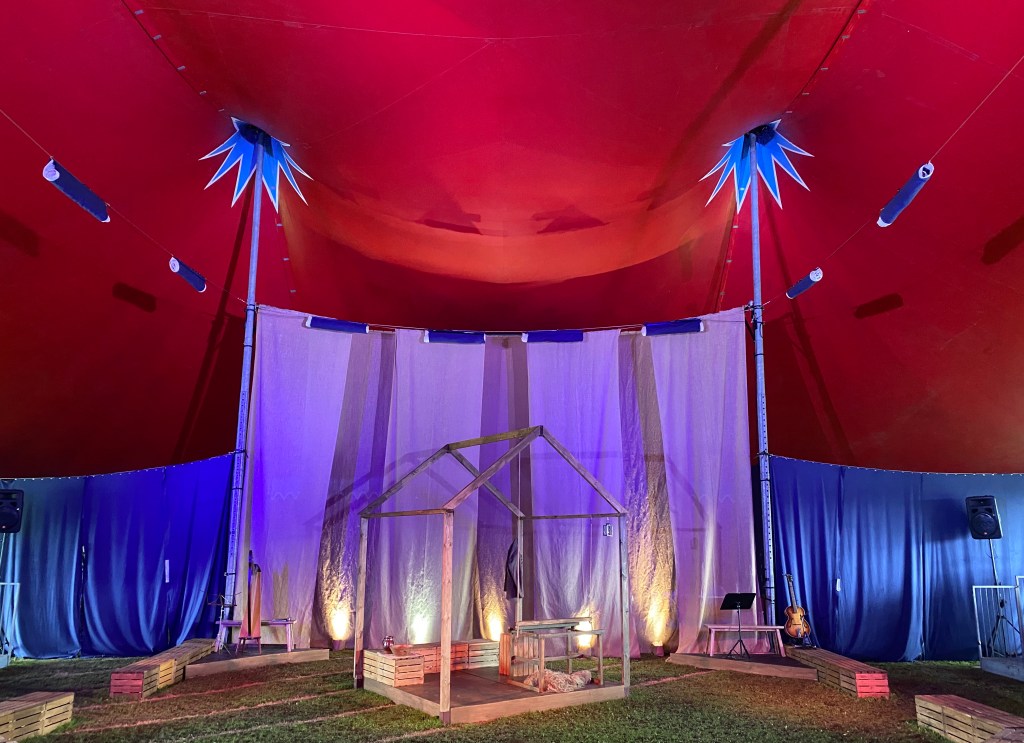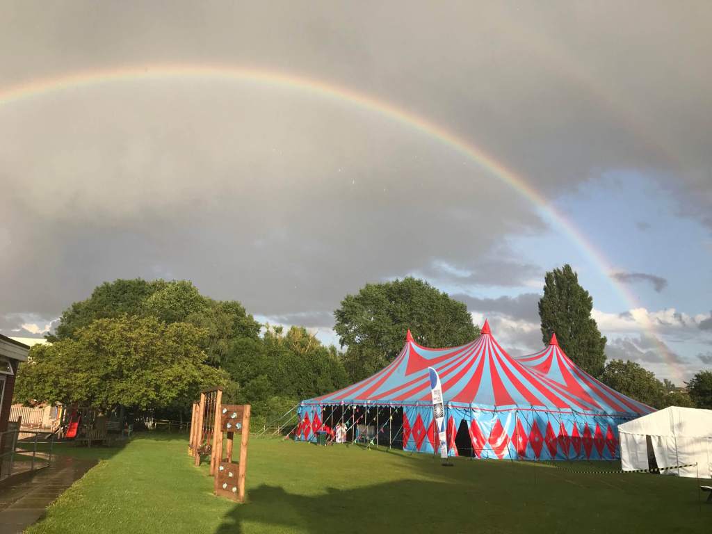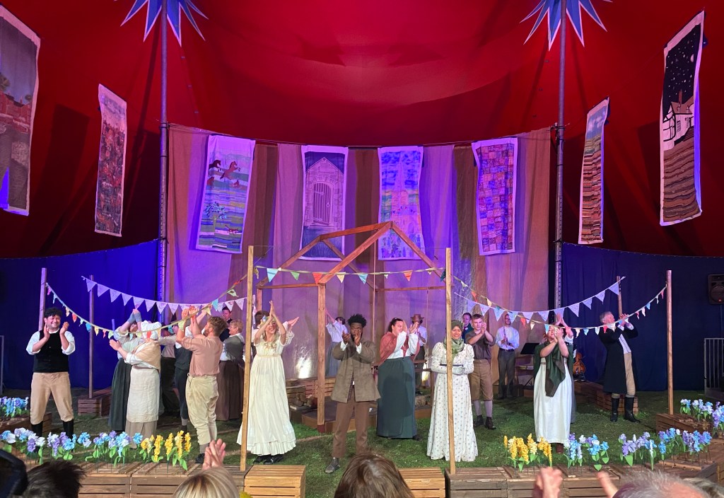 The Allesley Silas, a performance based on the novel Silas Marner, was the choice for From the Heart Theatre as a contribution to the Coventry, City of Culture 2021 festivities. The stage was set for an entertaining evening celebrating the connection between the novelist George Eliot with Coventry. Much of Eliot’s work was based on the people and places she knew well, with her characters reflecting the people who lived in the Coventry area. From the Heart Theatre brought together the local community from Allesley and Allesley Park to retell the story of Silas Marner, the weaver of Raveloe, based on the Allesley area. Silas Marner has wonderful scenes of the local colourful characters, particularly in the Rainbow Inn, a public house that is still serving pints in the village today. Indeed the Rainbow pop-up bar on the site of the performance tent was happily selling refreshments to the audience. The weather was undecided for most of the run, with blankets required at some shows as the wind whistled its way through the open sides of the tent, no problem as all vestiges of coronavirus would struggle to survive! So it seemed particularly fitting that a rainbow, almost a double rainbow, should arc a blessing over the tent!
