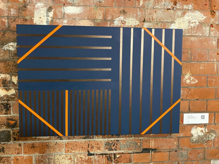 Personally I always fall for an abstract and this one has “haunted” me since the show! Abstract 220125 by Verónica Marcano. Apparently a larger version of a previous piece, I believe it could go larger and be even more impactful. The lighting at Bargehouse is minimal, and difficult to negotiate enough limelight for every artist. It is imperative not to mess with the lights we were told and this work did not reveal its true relationship of colours until photographed. The background appeared black and murky, but the light from the camera revealed a rich navy blue. The orange lines are beginning to subvert the pattern and break up the surface, but we see as yet still confined.