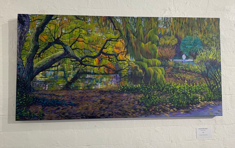 Round the Bend by Bev Jones attracted me with its strong palette. The bold colours of the trees, shrubs and leaves created a jungle of vegetation, but obviously a British park, ambiguous in its purposeful cultivation, yet feeling wild and unknown. The fracturing of the space and colour with the stark black branches was a clever device and one was left wondering why there was a person, a solitary man, in the frame. Bev said she wanted to encourage the viewer to go “round the bend.” Rather than madness there was a thoughtfulness and maybe the pop of turquoise is an invitation to stand still or the gateway to another bend.