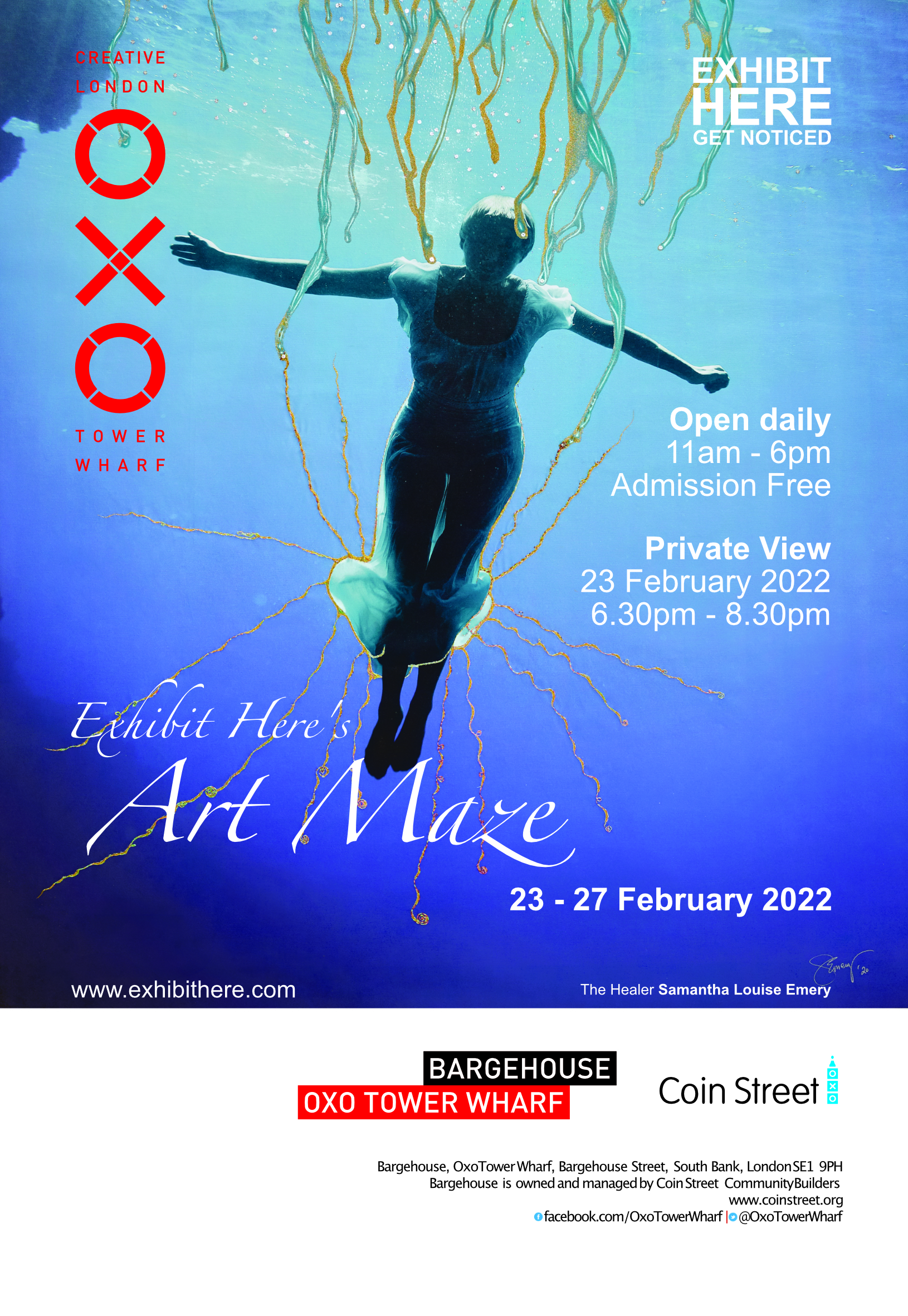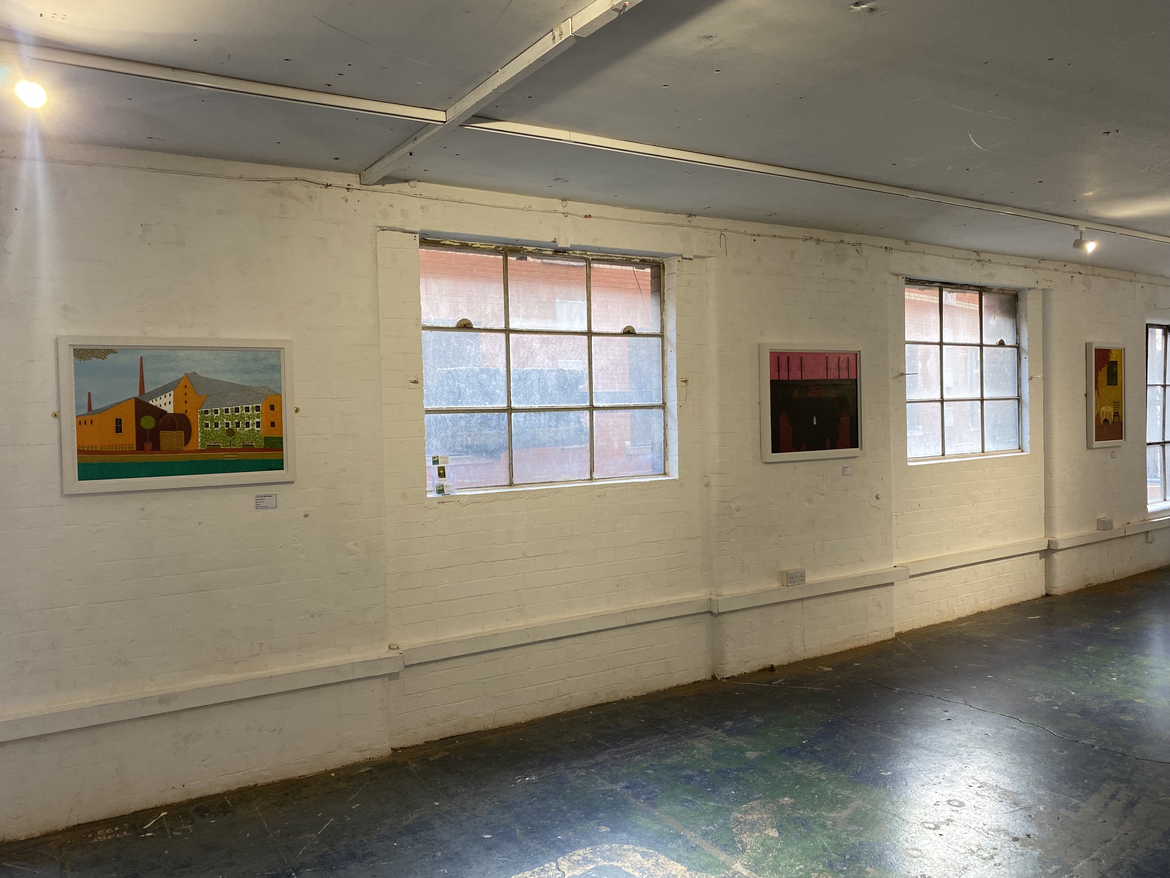 Four floors of an old Bargehouse at Oxo Tower Wharf on the South Bank in London, a prestigious venue and exciting opportunity to exhibit here! Intersillient were proud to secure a place for Bryan B. Kelly to present his work in such an atmospheric, quirky maze of a place. His naive, nostalgic and colourful pointillist style prompted much discussion beforehand on the best way to cover the suggested exhibition theme of “haunting”.