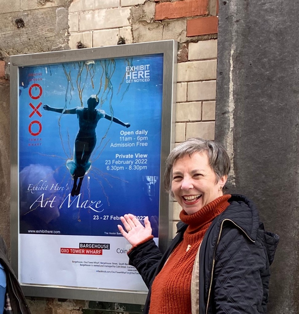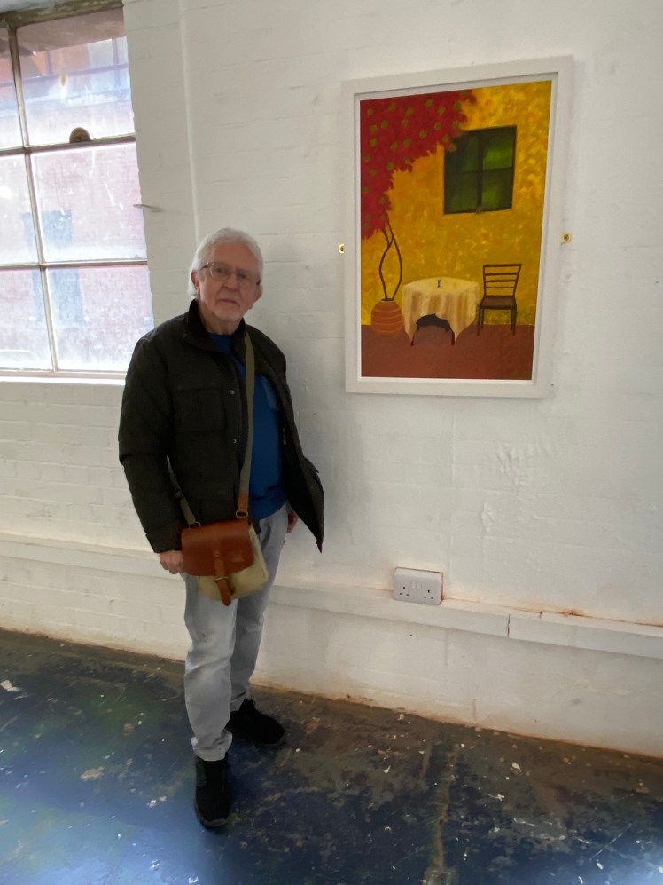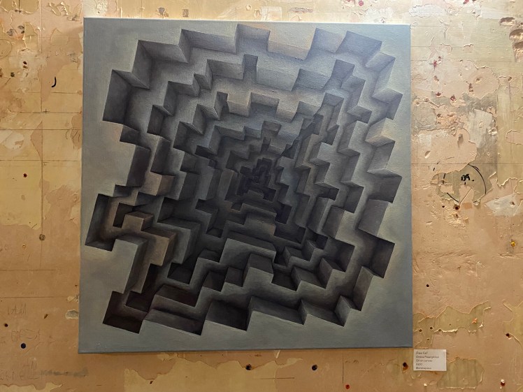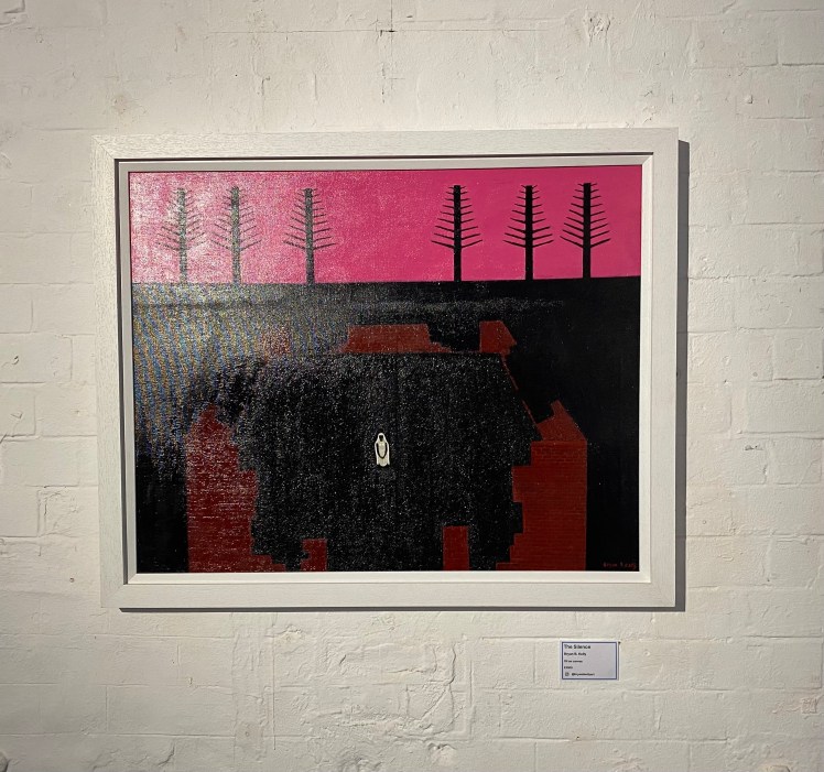 Lockdown, a comment on the death of cafe culture during the covid pandemic, The Old Mill Wheel, evoking nostalgia, and the striking Golden Ruin on its fantastic red hill have an other worldly feel. Leila Bibizadeh, Founder and Director of Exhibit Here suggested a theme of “haunting”, but with no imperative to follow it rather weakened the exhibition. The maze of different styles and artwork may have benefited from some continuity and the theme would have contributed to that cohesion. The resulting eclectic mix was stimulating, but maybe different choices of work may have been made if the haunting theme had been abandoned altogether. Limited by the strict labelling criteria there was little opportunity to expand on a narrative. This laid a level of importance on the Private View to gain more information and insight on the artworks by personal interaction, and also on the invigilation of the exhibition to promote, or indeed, prompt any sales. The organisation of the whole event from submission to de-install was extremely well organised, with clear instruction and calm, efficient execution. I was impressed with Leila’s coordination.
