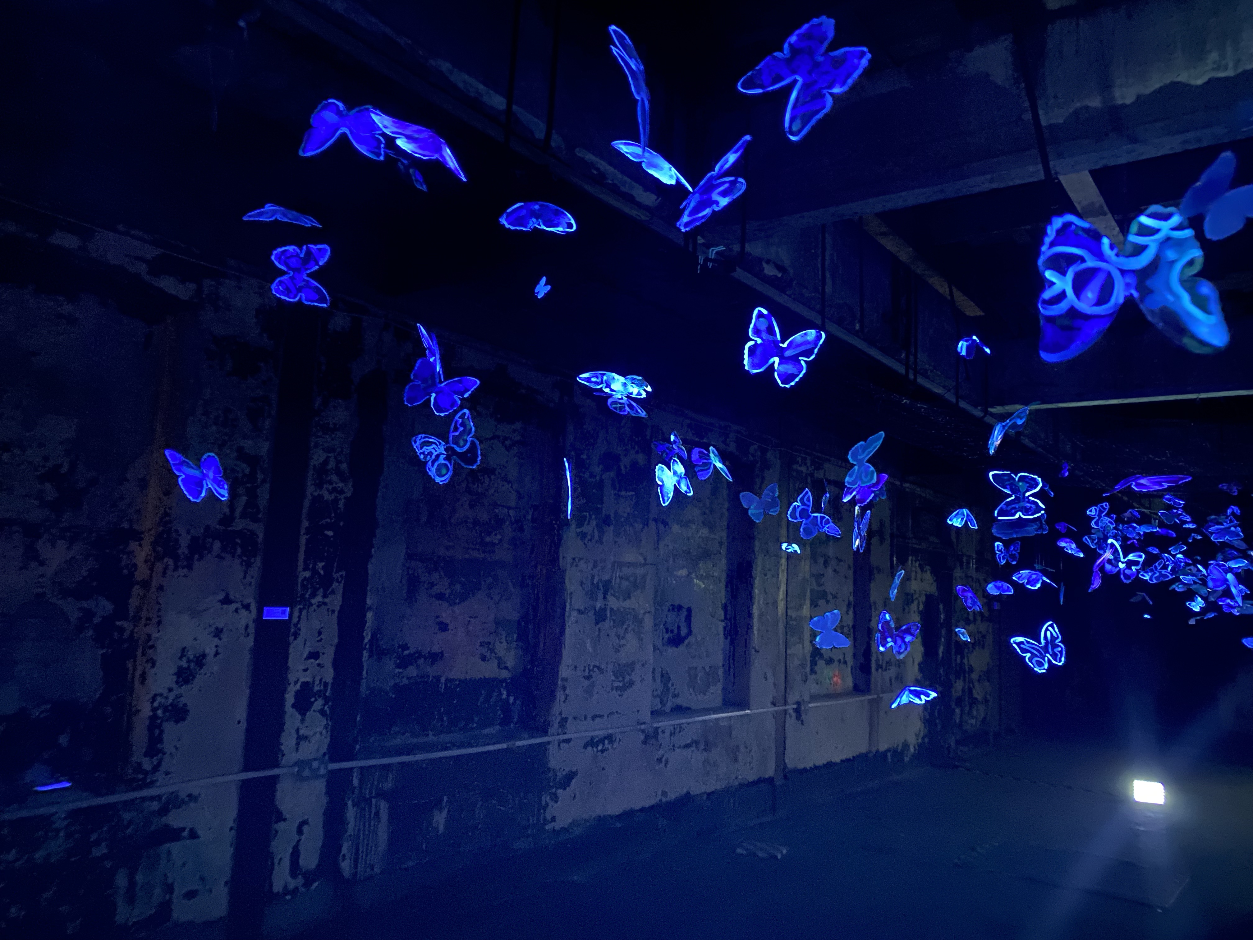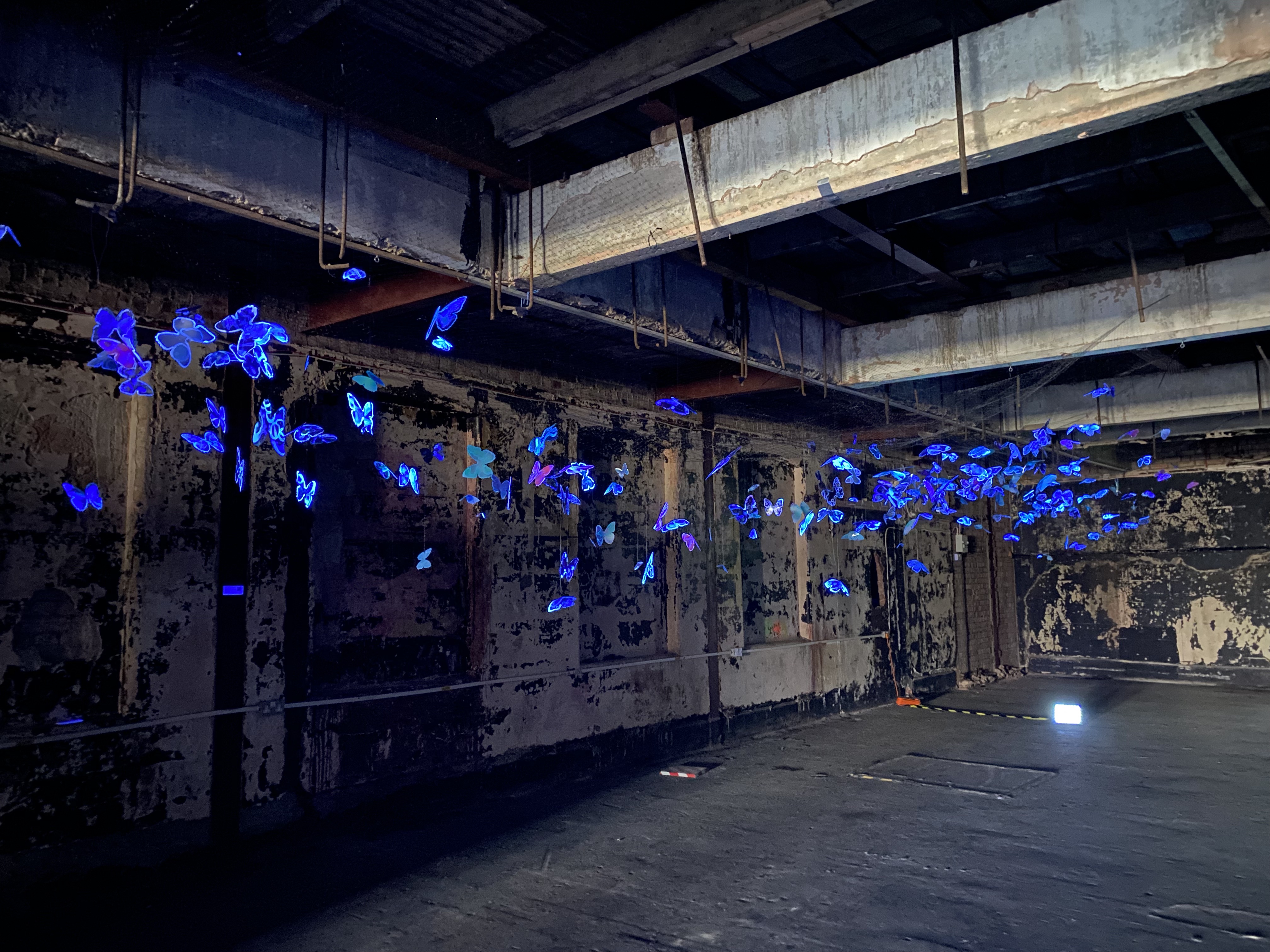 An artwork that did appeal to the theme of haunting was Anne Bennett’s Synchronous Kaleidoscope, a beautiful cloud of butterflies hovering in the very cool and creepy top floor. Dark at one end, even in daylight, with the far end of the room illuminated by sunshine, the glowing butterflies fluttered and bobbed in the slight movement of air as people walked underneath. It was magical! It would be gorgeous installed in a restaurant as long as the butterflies were out of an arm stretch reach. Singly they were delightful, but en masse they were captivating.