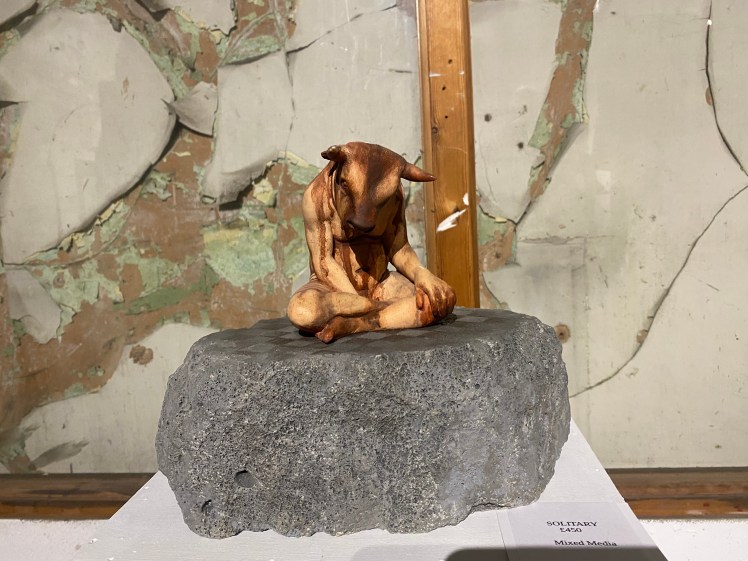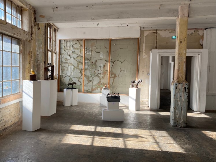 I imagine Jill Desborough was delighted to see her spot in the opposite corner. How amazing her sculpture display looked with the backdrop of an incredible wall, distressed, peeling and crumbling, framed and protected by glass it looks like a work of art in itself. The Bargehouse rocked its quirkiness to extreme, enigmatic and spooky in the evening, but funnelling and splashing the light around in the daytime. I wanted to join the Dance Macabre, joining hands and following their lead…even if it might be to a place I don’t want to be…! The loneliness of the Minotaur in Solitary was palpable, the dripping effect lowering and oppressing the figure as the daylight accentuated his despair.