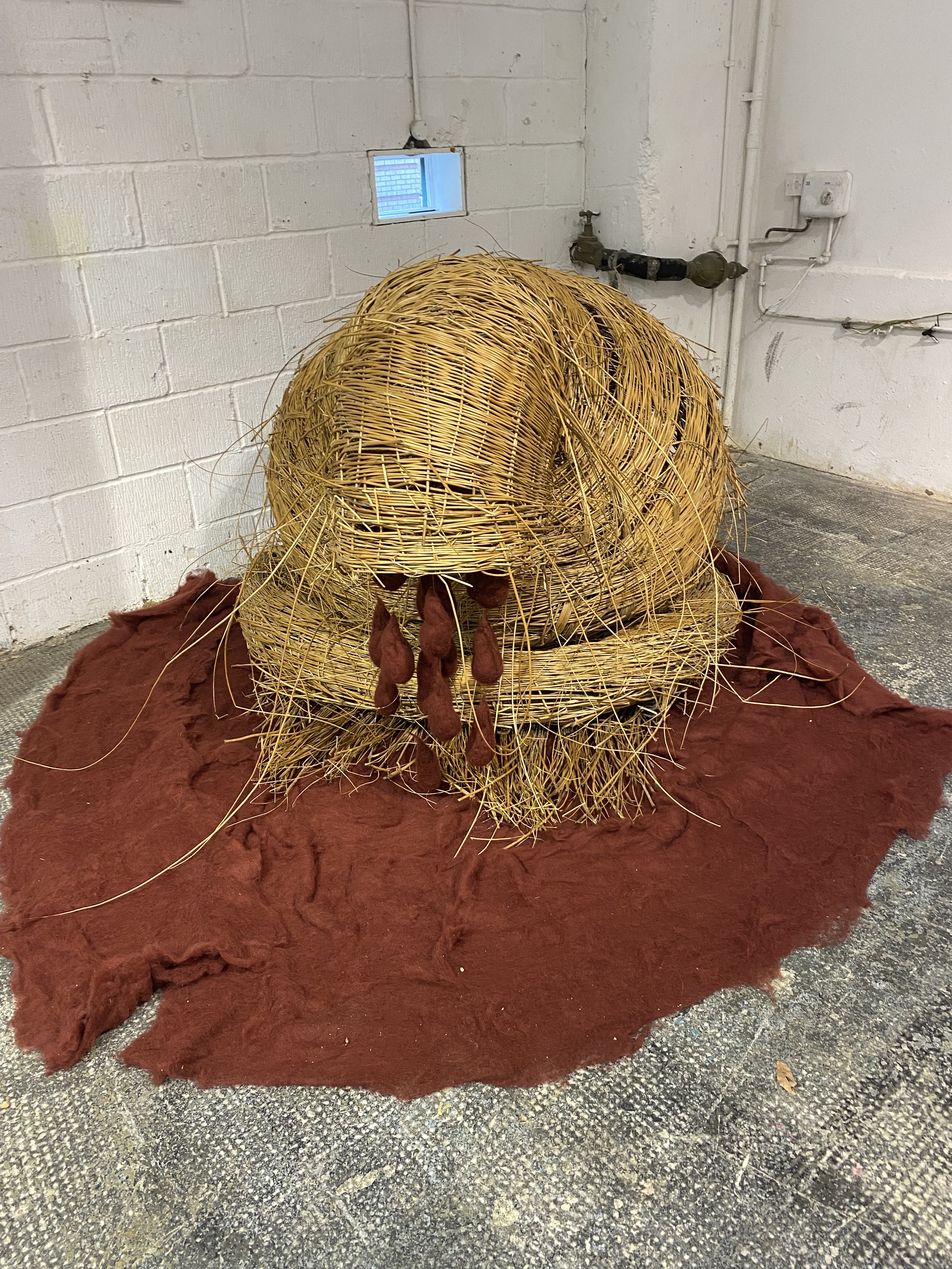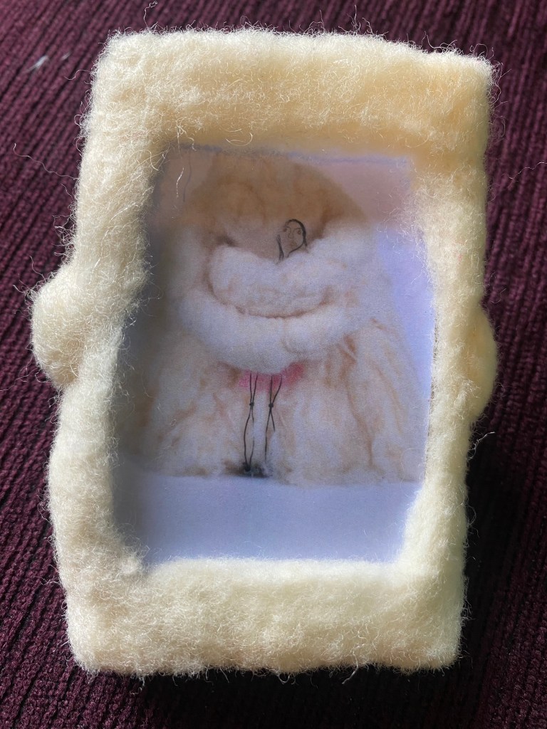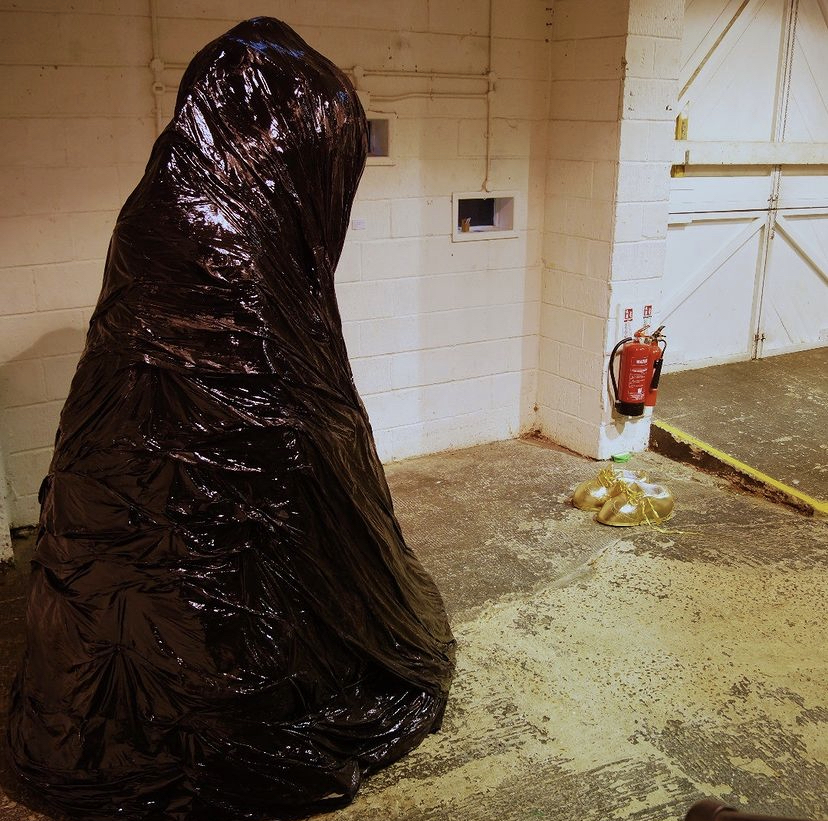 Kate Crumpler definitely had the most innovative business card, a limited edition I was privileged to be presented with one! Disturbed and challenged, but fun too is how I describe Kate’s work and it has left me thinking long after leaving the exhibition. The Grief That Never Was I found disturbing as the puddle of red fabric it sat on and drops of red felt suspended from the bulbous willow frame, not only looked like blood but also reminded me of menstrual blood. The title summoned miscarriage to mind and I was profoundly sad. I studiously ignored the looming black bin liner effigy. I was expecting it to reveal something interesting beneath the blackness, but no it remained taking up space like a blackness in the corner with a human or animal like shape and presence. I turned my back on it and concentrated on the Golden Golf Shoes! It wasn’t until later I realised that the blackness and the shoes were one piece entitled The Choice. I had unwittingly made my choice of going with the Dorothy-esque fairytale shoes and finding great joy in them. My daughter was invited to wear them and did so with alacrity, it was joyous as you can see in the video.