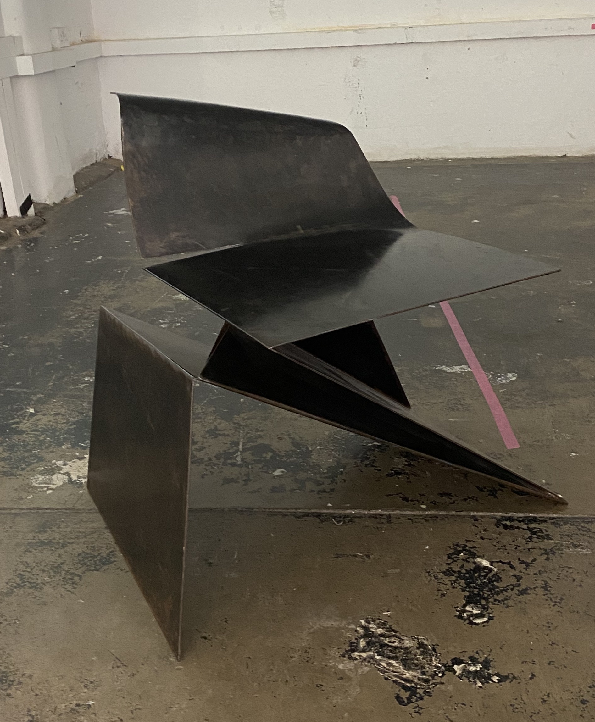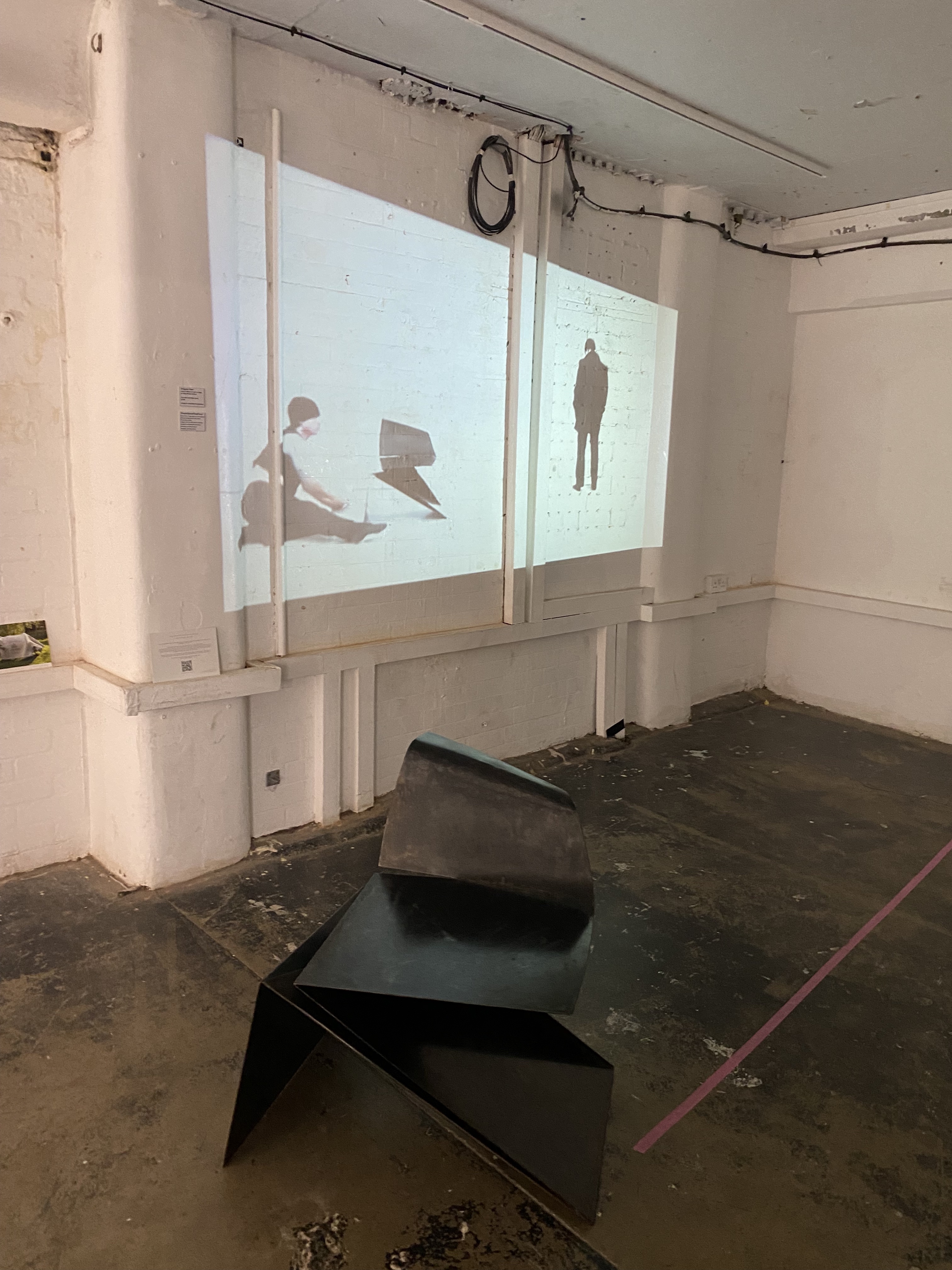 Origami Chair by Philip Michael Wolfson the video installation it contributes to. A loud soundtrack of booming and clanging sounds, reminiscent of what the chair might sound like if hit, resounds through the first floor of Bargehouse. The video by Maxim Nilov is projected with the stationary figure balanced on the grid of marks on the wall. The dancer slides in from the left and performs an intricate display of folding limbs and body, around, inside, on and through the image of the Origami Chair projected on the wall. The frozen element occasionally captures the dance movement as a still, superimposing more movement and then fading away. The hard surface of the steel chair is questioned as the movement flows around it, however the empty chair is in front of the viewer. Do we want to sit on it? Yes! Are we encouraged to? NO! Will we do so anyway? Our stasis as viewer is not fluid and we are a frozen audience. The choreography by the dancer Kirill Burlov is fluid and mesmerising, and the resonating sound was created for this Bargehouse event. The whole work has a new soundtrack, by Dom Bouffard, so the fluidity of interpretation is evident, but only if you know the earlier incarnation on the YouTube version is different, more shrill and less calamitous.