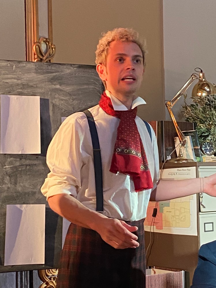 Andrew Cullum, playing Nicholas Bulstrode was brilliant.  He portrayed the banker with assurance, thoughtfulness and aplomb.  I really thought he was going to give me a savings account at 11.8% interest…those were the days!  I am sure he remembered our previous encounter in the bank on the Thursday when I found myself in the same position on the Saturday and he offered me the deal.  The natural conversation and ad-libbing required to make the encounter feel real was remarkable.  He commanded the space as bank manager, but when Raffles confronted him, the change in his demeanour alerted us to the potential devastation within Middlemarch society.  Keeping face and dealing with an inner turmoil was delivered with emotional intuition.