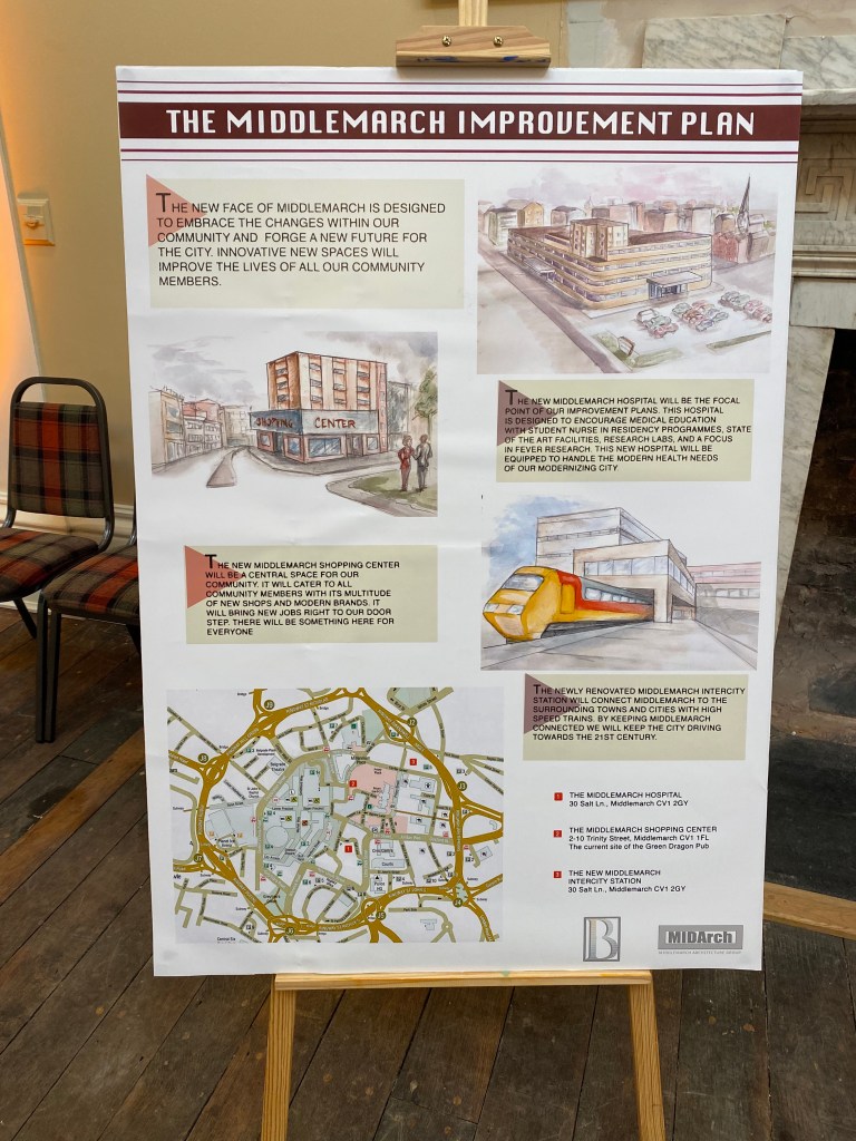 As a contribution to Coventry City of Culture 2021/22, this idea made sense.  Coventry being the place where George Eliot grew up, and where she based her town Middlemarch on, firmly places it in the Warwickshire countryside around Coventry and Nuneaton.  A cast of hundreds was not possible, so how to portray the town and the main characters?  Professional actors were engaged to carry the story and plot, but cleverly engaging volunteers from the Coventry area to convey, not only the atmosphere of Coventry, but also to become stewards.  Stewarding was imperative as the decision to engage in a progression around key places in the novel was integral to the event.  Four venues in close proximity were chosen to represent the Vincy family living room, the bank, the Town Hall and the Green Dragon pub.  Josephine Burton, Director and co-writer and Ruth Livesey, co-writer cleverly designed the narrative to make sense in whichever venue the audience found themselves.  Encouraged to move around between venues was at first a little confusing as everyone fears missing out, but it worked well.  Characters suggested ways of following the narrative as a journalist for Will Ladislaw’s newspaper The Pioneer, as a medical student following Dr Tertius Lydgate on his rounds, all as natural invitations or suggestions from the characters.  Rosamund Vincy took us to the bank, the auction at the Town Hall and the women’s craft circle, passing the nefarious Raffles drunk and singing on a bench on the way.  The play, entitled The Great Middlemarch Mystery, informed that a murder had happened and we, the audience were to sleuth out the victim and culprit.  A bold decision to frame the story within the murder, an important part of the George Eliot novel, but by no means the main thrust of the book.  It was a success, finding out the characters and possible motives did run true to the original work, and like the book, no real conclusion was drawn, but the consequences of the death spread far and wide in the community.