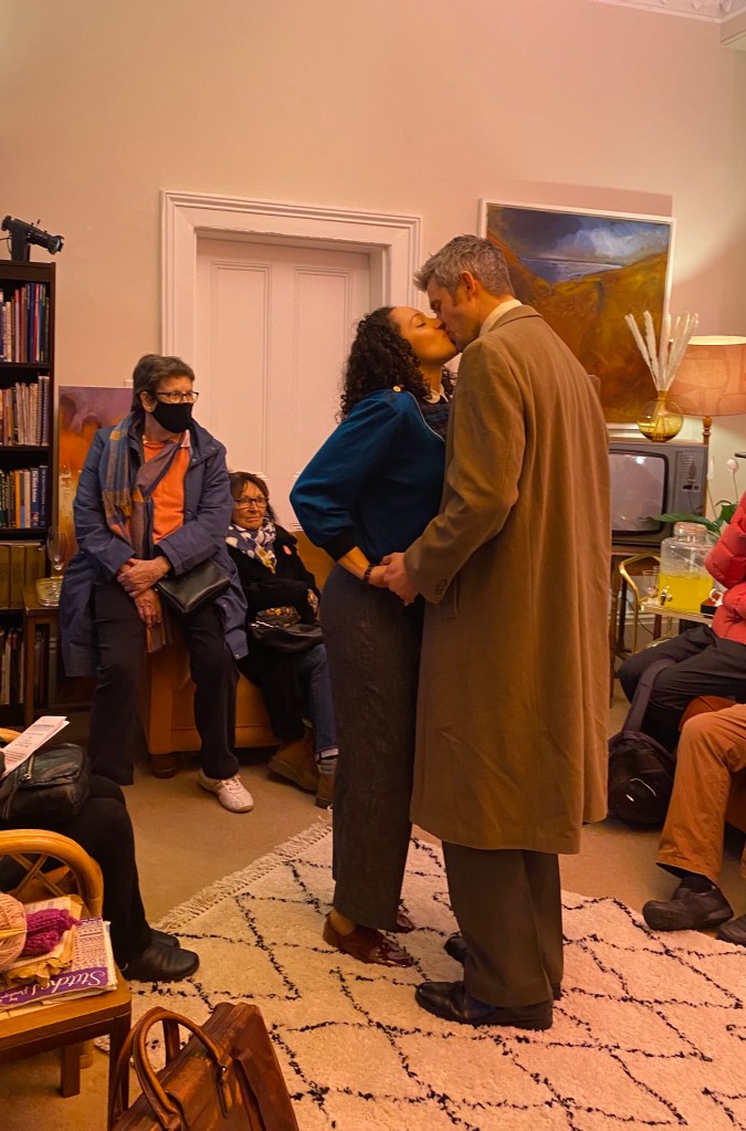Rosamund Vincy, played by Aimee Powell, and her mother, Lucy Vincy, played by Deborah Tracey, brought the domestic living room to life, offering refreshments and snippets of local news, inviting us to sit in their home as if expected visitors improvising and riffing off participants’ comments.  Their house was the front room belonging to the Dean of Coventry Cathedral, which made me smile as we were standing next to each other as the scene unfolded.  We were offered cake and Rosamund sang for us dressed in clothes that best evoked the 1980s, the small white Peter Pan collar, wide shouldered purple coat and red beret were perfect.  Feeling a little pleased that a couple of the salvaged theatre costumes I had found with Siena Tone, Costume Assistant, were used in the production it may actually have been easier to make 19th century period dress!  It seems the 1980s is difficult to source in costume at least.  It was in the Vinci’s home the orchestration of visits by the doctor and how the story was unfolding elsewhere became clear.  Discreet radio communication helped to ease the appearances and keep the continuity flowing.  Dr Lydgate must have been so out of breath on his rounds, he seemed to be required at many places at many different times.  A Dash Art indeed!