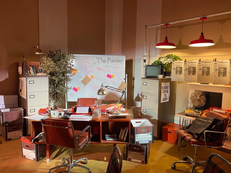 Set design and attention to the detail required to set the show in 1982 was well thought through.  The Vincy living room had an old TV, telephone and stacked Hi Fi system.  The script allowed for mentions of the Falklands War, the new Intercity links to Coventry, the planned visit of the Pope, and in Bulstrode’s Bank the trend in extreme interest rates and the debate around Mutual Societies.  The newspapers were dealing with the new technology and the car industry, a mainstay for Coventry, was in serious decline.  John Raffles, played by George Beach, taking his look from Del Boy, Only Fools and Horses in double denim and a sheepskin jacket, sprawling in a drunken stupor on the bench was singing Don’t You Want Me Baby; which won Best Breakthrough Act Brit Award for the Human League in 1982.  It was a nostalgic trip down the 1980s memory lane for many.