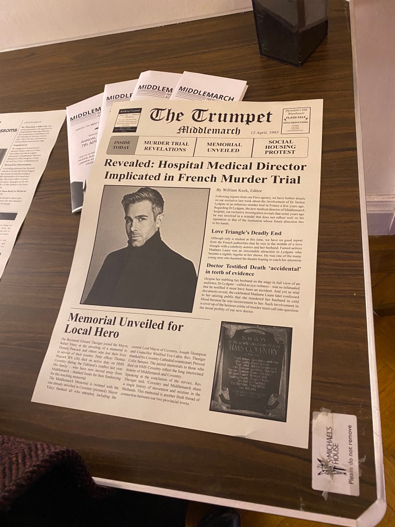 Will Ladislaw, played by Ryan Van Champion, was apparently a late addition to the cast.  Josephine Burton suggested he was needed to cement the events together through reporting with The Pioneer, his innovative paper to rival the established The Trumpet, the 1980s changes in the newspaper industry with the introduction of online production did not go unobserved.  Editions of The Pioneer were available at the venues, with updates appearing throughout the evening reporting rumour and local news as it happened, which added an authenticity to the performance.